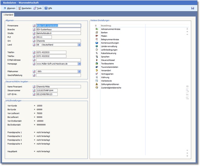 In den Basisdaten werden grundlegende Informationen über Ihre Firma hinterlegt. Die Angaben, die Sie in den Basisdaten festlegen, werden auch in übergeordneten Bereichen der Warenwirtschaft benötigt.