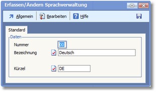 << Hier KLicken um eine Inhaltsübersicht anzuzeigen >> Navigation: Warenwirtschaft > Stammdaten > Basisdaten > Sprachen > Die Karteikarte "Standard" |