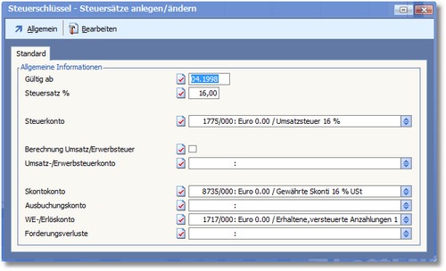 Der Betrag aus der Steuerberechnung wird diesem Konto zugebucht. Es handelt sich also entweder um ein Vorsteuerkonto (Schlüssel für Wareneingänge) oder um ein Umsatzsteuerkonto (Schlüssel für Warenausgänge).