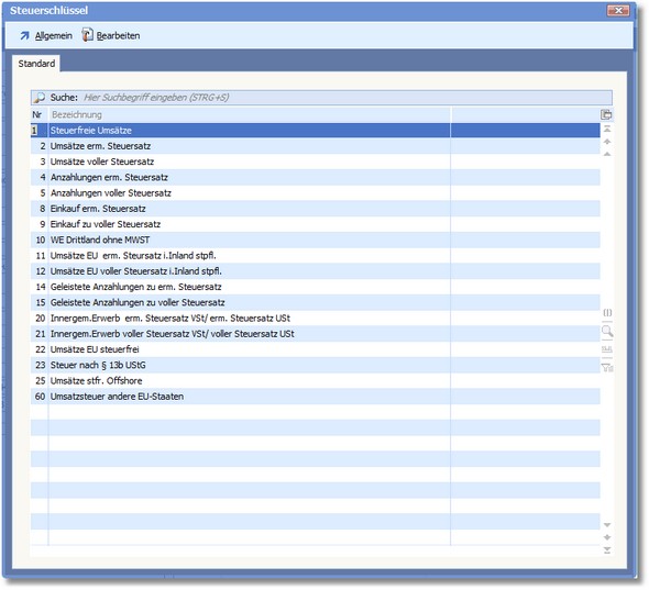 << Hier KLicken um eine Inhaltsübersicht anzuzeigen >> Navigation: Finanzbuchhaltung > Stammdaten > Basisdaten > Steuerschlüssel |