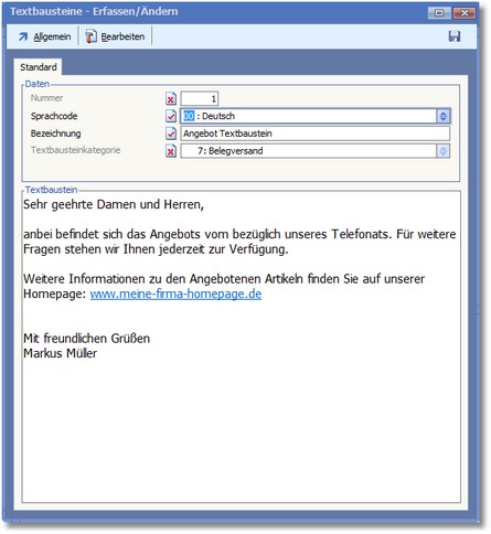 Hier werden die allgemeinen Angaben zum Textbaustein eingetragen. Speichern Sie Ihre Eingaben mit [F10] bzw. Klick auf den Quicktool-Button <Speichern>.