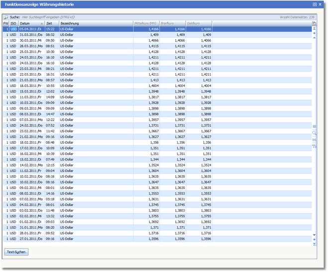 2. Drücken Sie die Funktionstaste [F9] oder betätigen Sie den Button <Währungshistorie>, um die Tabelle mit den Änderungseinträgen aufzurufen.