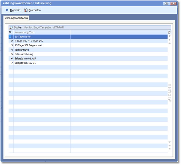 Das Programm öffnet die vorgelagerte Auswahltabelle der Zahlungskonditionen.