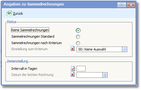 Innerhalb der Kundendaten besteht die Möglichkeit, Einstellungen für die automatische Erstellung von Sammelrechnungen zu hinterlegen. Diese Parameter sind dann von Bedeutung, wenn mehrere Belege (z.B. Lieferscheine) eines Kunden in eine Sammelrechnung gewandelt werden.
