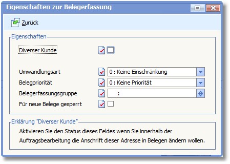 << Hier KLicken um eine Inhaltsübersicht anzuzeigen >> Navigation: Warenwirtschaft > Stammdaten > Adressstamm > Adressen erfassen/ändern > Die Karteikarte "Standard" (Firma) > Eigenschaften Belegerfassung |
