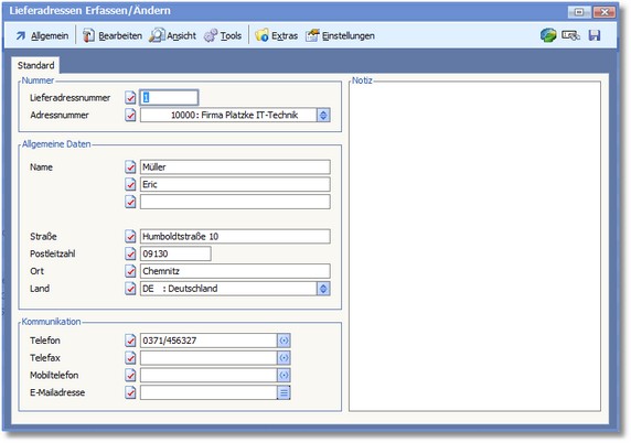 Die Daten zu einer Lieferanschrift werden in dieser Karteikarte verwaltet.