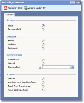Legen Sie in diesen Bereichen durch Aktivierung des entsprechenden Radiobuttons fest, um welchen Adresstyp bzw. welche Kontaktart es sich bei der neu anzulegenden Adresse handelt.