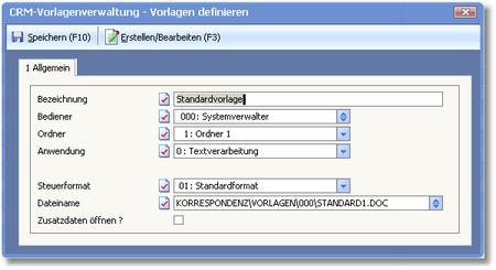 Aktivieren Sie den Status dieses Feldes þ, wenn die Vorlage auch bei der Erstellung von Einzelbriefen die Serienbrieffunktion der Textverarbeitung zur Verfügung stehen soll.