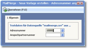 Mit [F3] starten Sie die Erstellung der Vorlage. Im folgenden Dialogfenster kann nun eine Adresse bzw. ein Ansprechpartner als Beispiel angegeben werden.