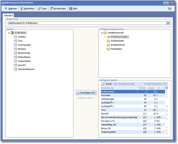 Speichern [F10] erstellt den neuen Selektionspool mit den hier festgelegten Einstellungen.