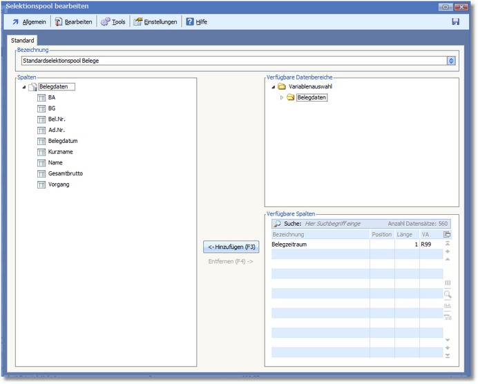 Verlassen/Beenden [ESC] schließt den Bearbeitungsdialog und kehrt in die Karteikarte "Selektionspool" zurück.