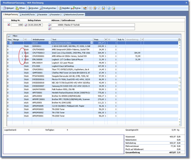 Der Warenkorb enthält eine Zusammenstellung von Artikeln, die der Kunde in der letzten Zeit bestellt bzw. gekauft hat. Dies ermöglicht den Mitarbeitern eine schnelle Belegerfassung über dem Adressstamm, da keine zeitaufwändige Suche nach Artikeln, welche der Kunde schon einmal bestellt hat, erfolgen muss. Der Mitarbeiter muss nur noch für die entsprechenden Artikel die gewünschte Menge eintragen und vom Programm die entsprechenden Belege erzeugen lassen.