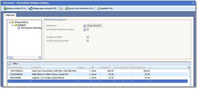 Der Warenkorb wird nun entsprechend der vorher festgelegten Einstellungen mit Artikelpositionen gefüllt und geöffnet.