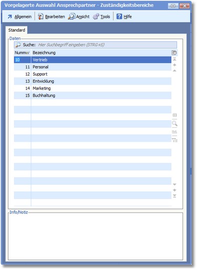 Ansprechpartner können Zuständigkeitsbereichen zugeordnet werden. Zuständigkeitsbereiche können Sie wie folgt definieren: