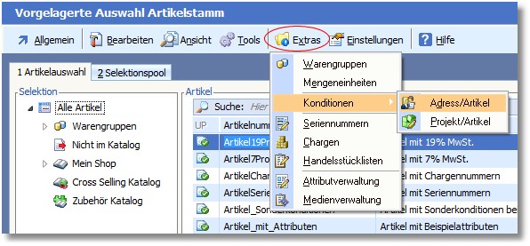 klicken Sie mit der Maus in der Symbolleiste des Artikelstamms auf <Extras> und "Konditionen > Adress/Artikel".