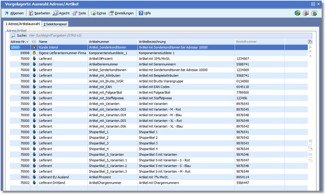 Das Programm öffnet die vorgelagerte Auswahl der Adress/Artikel.