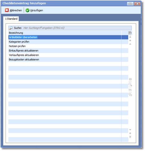 Mit dem Menüeintrag "Bearbeiten > Checklisteneintrag hinzufügen" in den Artikelstammdaten können dem Artikel ToDo´s hinzugefügt werden.