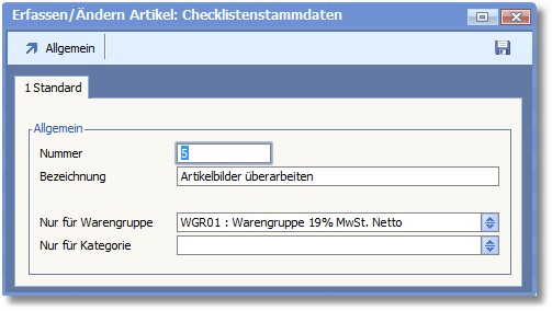 << Hier KLicken um eine Inhaltsübersicht anzuzeigen >> Navigation: Warenwirtschaft > Stammdaten > Artikelstamm > Artikelstamm - Menü > Checklistenstammdaten > Checklistenstammdaten erfassen/ändern |