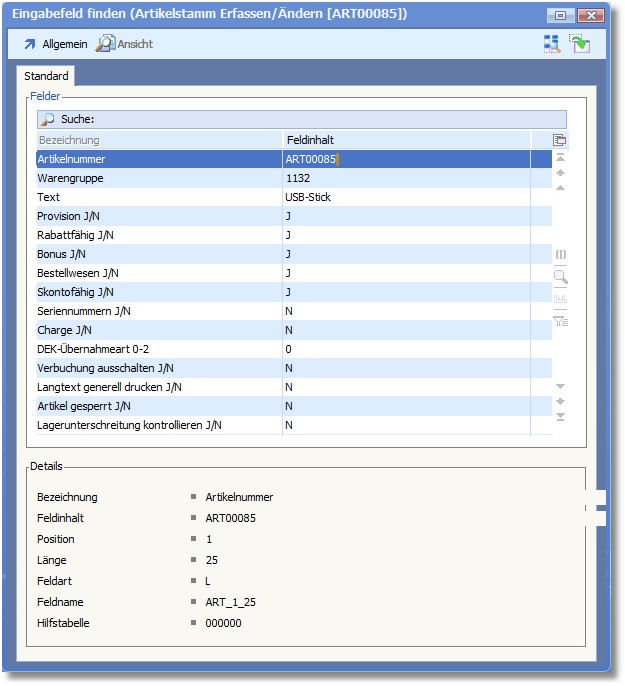 Hier werden alle im Artikelstamm verwendeten Felder mir ihrem derzeitig aktuellen Inhalt in einer Tabelle angezeigt.