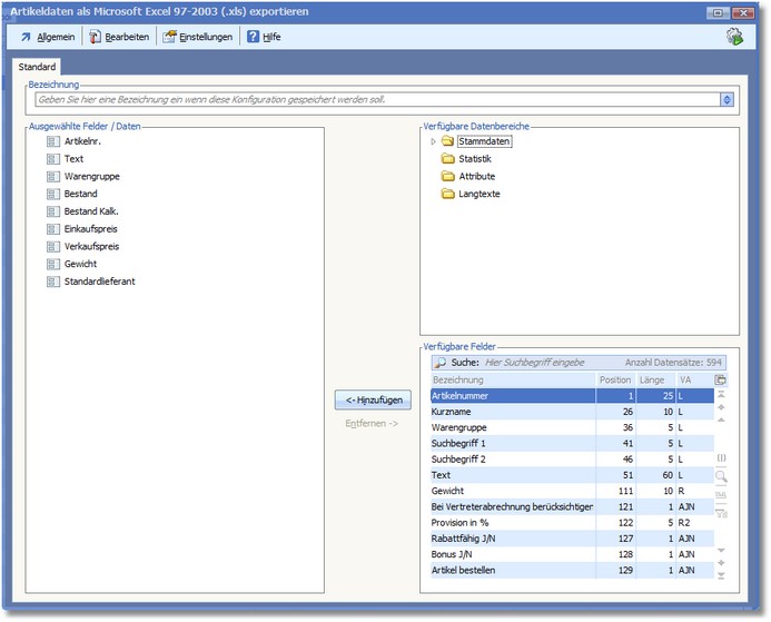 In dieser Maske können Sie die zu exportierenden Daten nach Ihren Bedürfnissen zusammenstellen, diese Einstellungen speichern und gespeicherte Konfigurationen bei Bedarf wieder aufrufen.