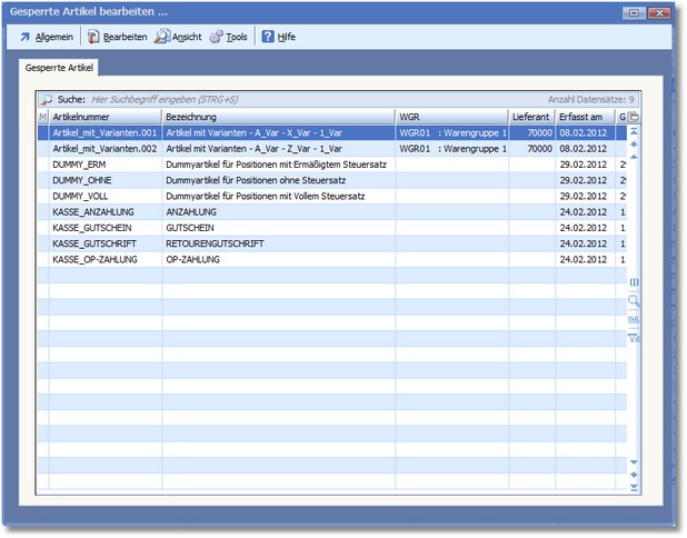 In diesem Dialog werden gesperrte Artikel in einer Tabelle angezeigt und verwaltet.
