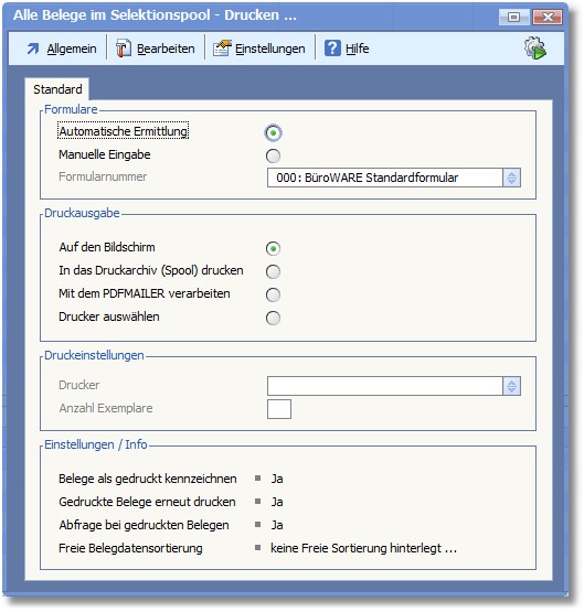 Das Programm öffnet den Dialog „Alle Belege im Selektionspool - Drucken".
