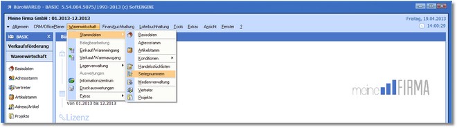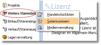 1. Klicken Sie mit der Maus im Hauptmenü auf "Warenwirtschaft > Stammdaten > Seriennummern".