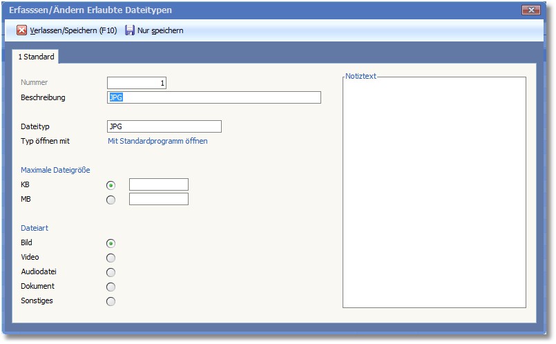 << Hier KLicken um eine Inhaltsübersicht anzuzeigen >> Navigation: Warenwirtschaft > Stammdaten > Medienverwaltung > Erlaubte Dateitypen erfassen/ändern |