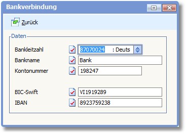 Diese Felder nehmen die Bankverbindung des Vertreters auf.