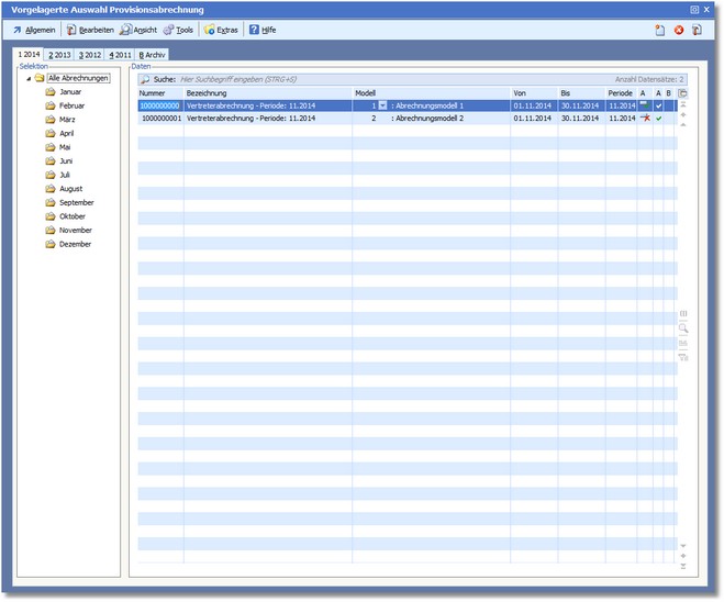 Über diesen Dialog werden die Vertreterabrechungen erstellt und bearbeitet.