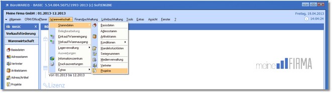 1. Klicken Sie mit der Maus im Hauptmenü auf "Warenwirtschaft > Stammdaten > Projekte".