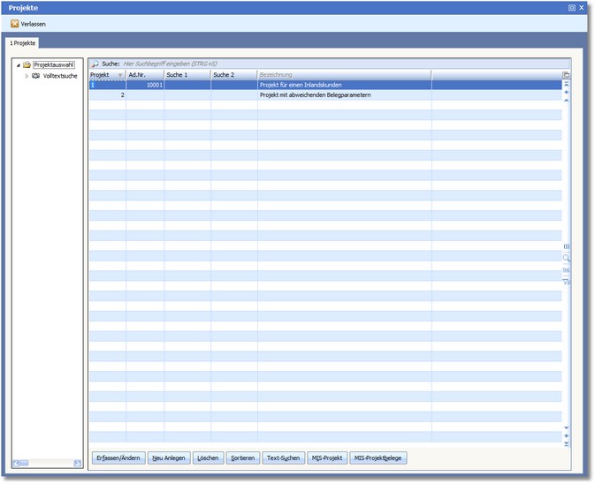 Innerhalb dieser Tabelle sind die bereits beschriebenen Such- und Sortierfunktionen aktiv. Ein neues Projekt wird mittels des Buttons <Neu Anlegen> erfasst, bestehende Projekte können Sie in der Tabelle auswählen und mit [RETURN] oder mit einem Mausklick auf den Button <Erfassen/Ändern> in Bearbeitung nehmen.