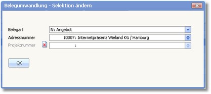 Belegübersicht Diese Funktion öffnet das Dialogfenster "Belegumwandlung - Selektion ändern".
