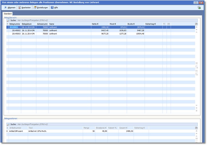 << Hier KLicken um eine Inhaltsübersicht anzuzeigen >> Navigation: Warenwirtschaft > Belegbearbeitung > Wandlung, Teilwandlung und Duplikation > Wandlung/Duplikation in der Positionserfassung > Wandlung > Die Auswahltabelle "...einzelne/alle Positionen übernehmen" |