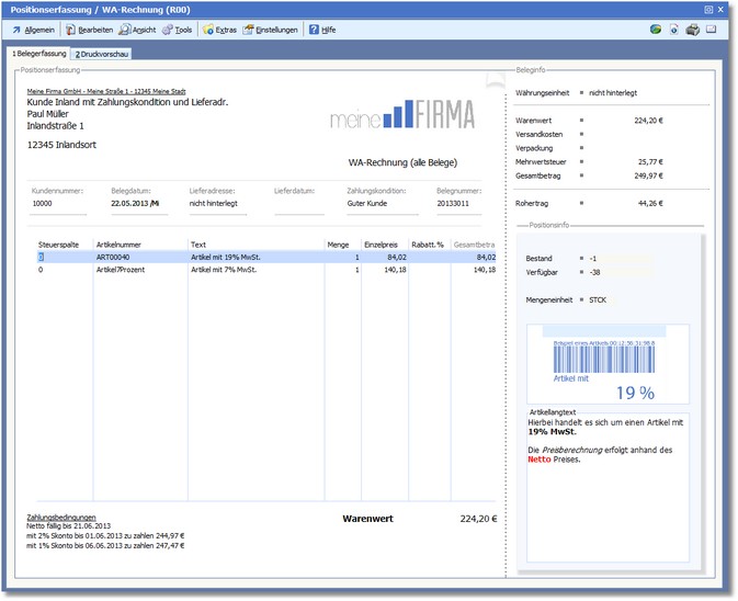 Beim Aktivieren der Karteikarte "Druckvorschau" wird eine Druckvorschau mit den aktuellen Belegdaten erstellt. Um nachträglich Änderungen an den Belegdaten vorzunehmen, wechseln Sie nur auf die Karteikarte "Belegerfassung" und nehmen Sie die gewünschten Änderungen vor.