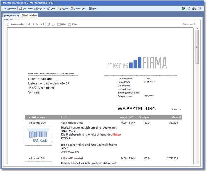 << Hier KLicken um eine Inhaltsübersicht anzuzeigen >> Navigation: Warenwirtschaft > Belegbearbeitung > Einkauf/Wareneingang > Karteikarte "Druckvorschau" |