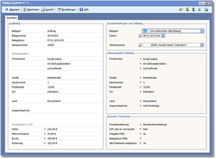 3. Überprüfen Sie die hier angezeigten Einstellungen und nehmen Sie bei Bedarf noch Änderungen (z.B. an Belegart oder Adressnummer) vor. 4. Starten Sie die Duplikation anschließend mit [F9].
