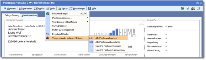 Hier wird beschrieben, wie Sie alle Positionen aus einem oder mehreren Belegen in den aktuellen Beleg kopieren können.