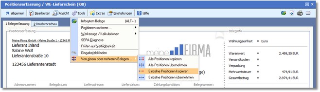 1. Wählen Sie in der Positionserfassung den Menüpunkt "Tools > Von einem oder mehreren Belegen..."