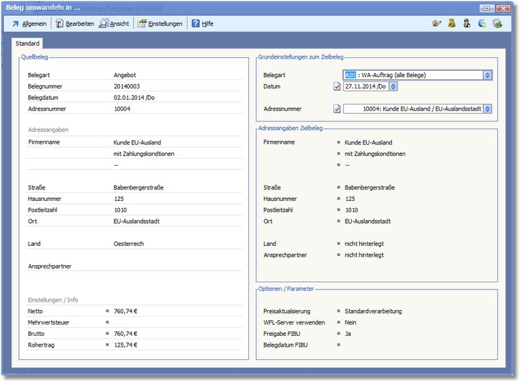 3. Überprüfen Sie die hier angezeigten Einstellungen und nehmen Sie bei Bedarf noch Änderungen an den Belegdaten vor. 4. Drücken Sie anschließend [F9], um die Belegwandlung zu starten.