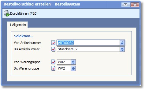 3. Grenzen Sie die Artikel, für die ein Bestellvorschlag erstellt werden soll, in den Feldern VON ARTIKELNUMMER / BIS ARTIKELNUMMER und in den Feldern VON WARENGRUPPE / BIS WARENGRUPPE ein.