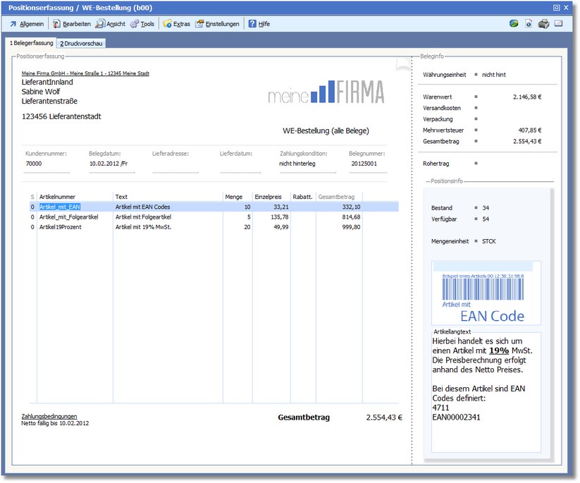 Beim Aktivieren der Karteikarte "Druckvorschau" wird eine Druckvorschau mit den aktuellen Belegdaten erstellt. Um nachträglich Änderungen an den Belegdaten vorzunehmen, wechseln Sie nur auf die Karteikarte "Belegerfassung" und nehmen Sie die gewünschten Änderungen vor.