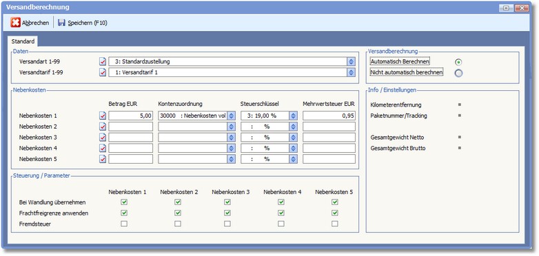 Das Programm öffnet den Dialog "Versandberechnung", in dem die Einstellungen zur Berechnung der Versandkosten hinterlegt werden: