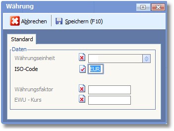 Wählen Sie hier mit [F5] die gewünschte Währungseinheit für den Beleg aus. Wenn Sie Ihre Eingabe mit [RETURN] bestätigen, werden die nachfolgenden Felder automatisch mit den in den Währungsstammdaten hinterlegten Werten gefüllt.
