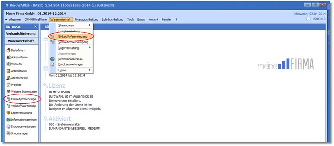 1. Klicken Sie mit der Maus im Hauptmenü auf "Warenwirtschaft > Einkauf/Wareneingang".