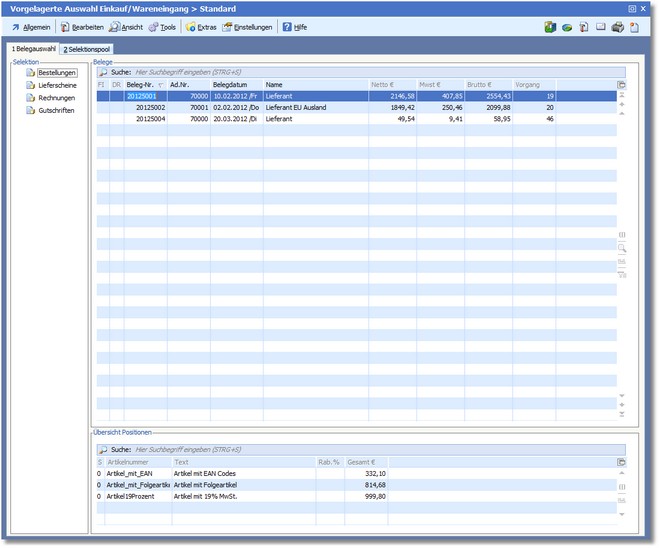 Das Programm öffnet die vorgelagerte Auswahltabelle Einkauf/Wareneingang.