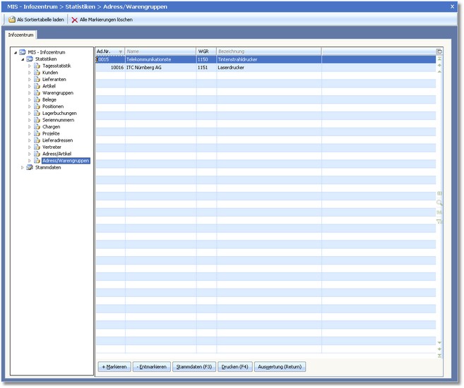 << Hier KLicken um eine Inhaltsübersicht anzuzeigen >> Navigation: Warenwirtschaft > Auswertungen > Informationszentrum > MIS-Infozentrum > Adress / Warengruppen |