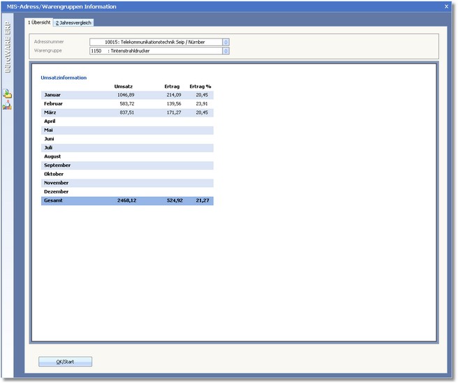 Mit "Analyse" für Adress/Warengruppen stehen Umsatz- und Ertragsinformationen des aktuellen Jahres zu den Adress/Artikeln zur Verfügung.