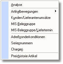 In der Tabelle "Artikelauswahl" können Sie einen Artikel suchen und über den Button <Auswertung> oder mit der Taste [RETURN] öffnet sich ein Popup-Menü mit folgenden Analysemöglichkeiten: