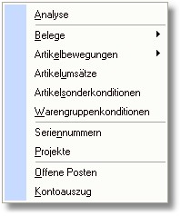 In der Tabelle können Sie einen Kunden suchen und über den Button <Auswertung> oder mittels der Taste [RETURN] öffnet sich ein Popup-Menü mit folgenden Analysemöglichkeiten: